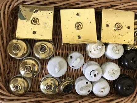 磁器をベースに真鍮のカバーがついたものや、ちょっとチープな感じがするプラスティックを組み合わせた照明のスイッチです。