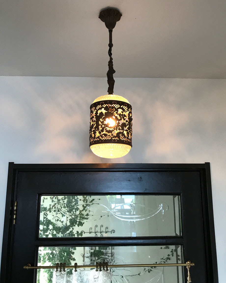 ( 写真は、イギリス・ヨークシャーの住宅で使われていたドアと、模様に特徴のあるフランス・アンティークのペンダントライトです。)
